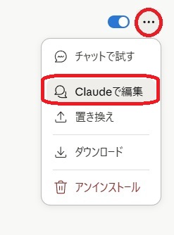上記票の項目が入っていない場合は右上の”・・・”をクリックし、「Claudeで編集」をクリックすると、チャット画面上に対象スキルが入力されるので、編集箇所を指示して送信します。