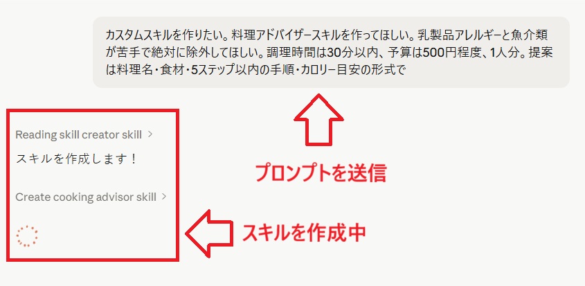 スキルズが違うのは読み込みのタイミングです。料理の相談だとClaudeが判断すれば、毎回スキルを読み込んで実行します。会話がどれだけ長くなっても、プロジェクトの設定量がどれだけ増えても、スキルズは独立して機能します。