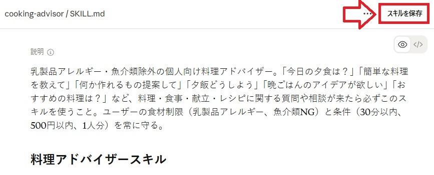 チャット画面の場合は出力されたスキルファイル右側、アーティファクト画面の場合は右上の「スキルを保存」をクリックすると、作成したスキルがインストールされます。