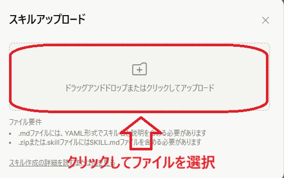 - アップロード画面中央の枠内をクリックし、ダウンロードしたスキルファイルをWクリック
