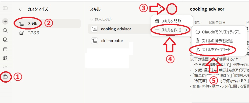 もうひとつが自分で作るカスタムスキルで、料理の条件、仕事のルール、出力フォーマットなど、自分専用のルールを自由に登録出来ます。